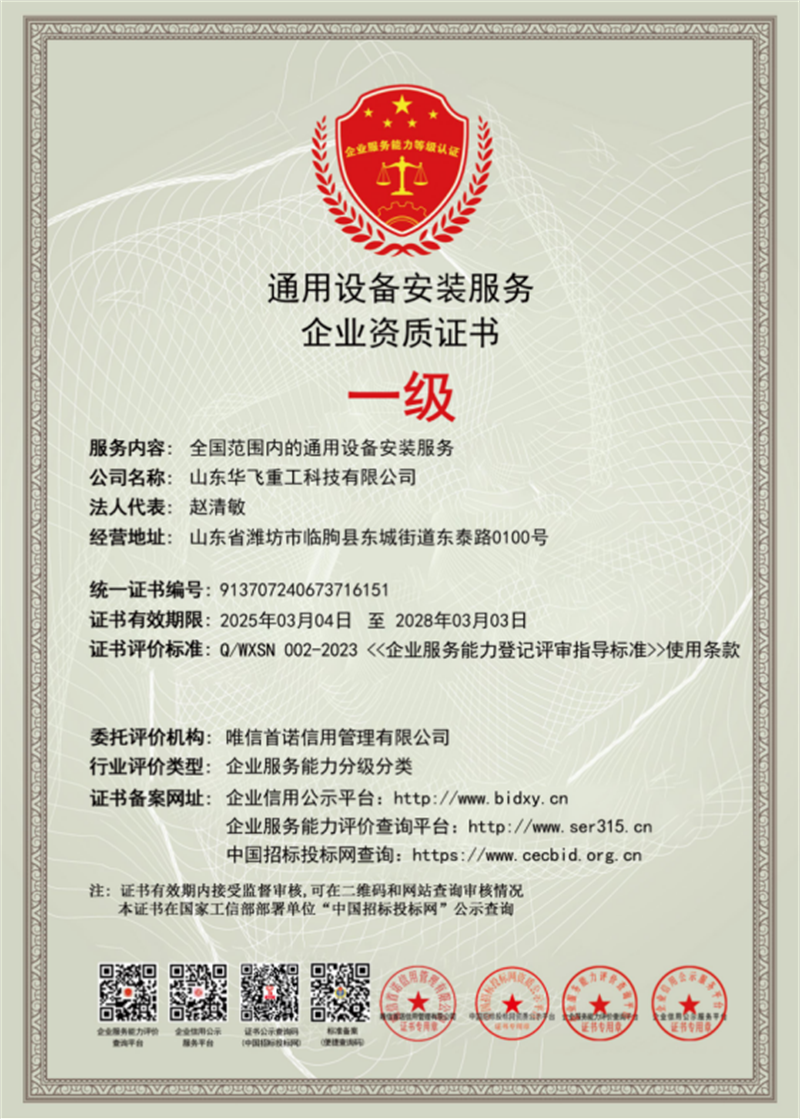 企业服务能力等级认证证书